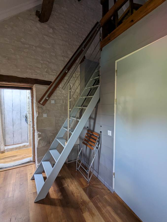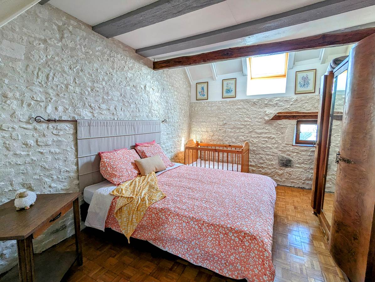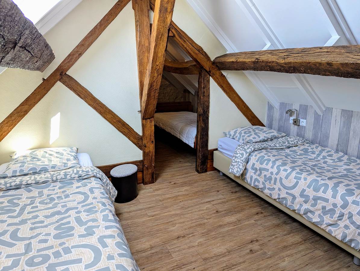 Le deuxième étage propose une troisième chambre cosy, nichée sous les toits. Avec ses poutres apparentes conservées et ses deux lits jumeaux, c'est un véritable cocon, parfait pour un séjour paisible.