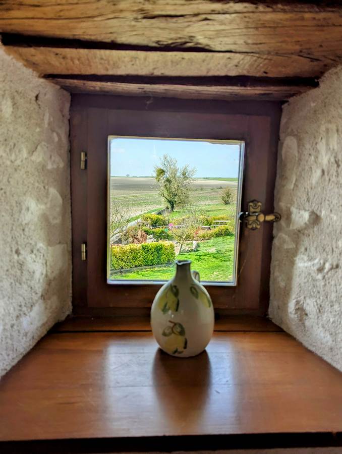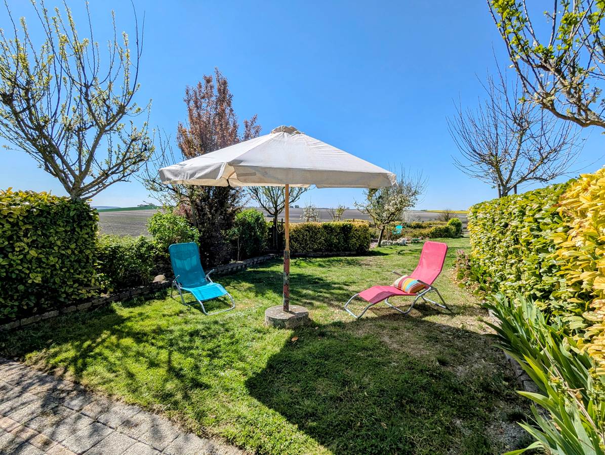 De grandes portes-fenêtres s'ouvrent sur une vaste terrasse orientée plein ouest, offrant une vue dégagée sur les champs vallonnés, un village médiéval au loin, et des couchers de soleil spectaculaires.