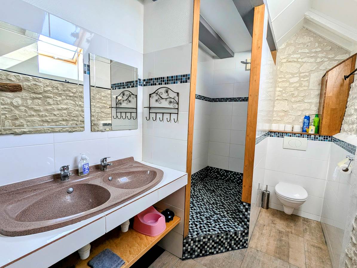 Au premier étage, la chambre principale vous accueille avec un lit king-size et des pierres apparentes qui rappellent le charme d'antan de la cheminée située en dessous. La seconde chambre, plus sobre, est aménagée avec deux lits jumeaux, idéale pour les enfants ou les amis. Une grande salle de bain moderne complète cet étage, avec une douche à l'italienne, une double vasque et un WC.